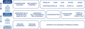 L’Associazione è l’interlocutore di riferimento delle Istituzioni italiane per le politiche industriali legate alla microelettronica. Tra i principali collegamenti e collaborazioni figurano: