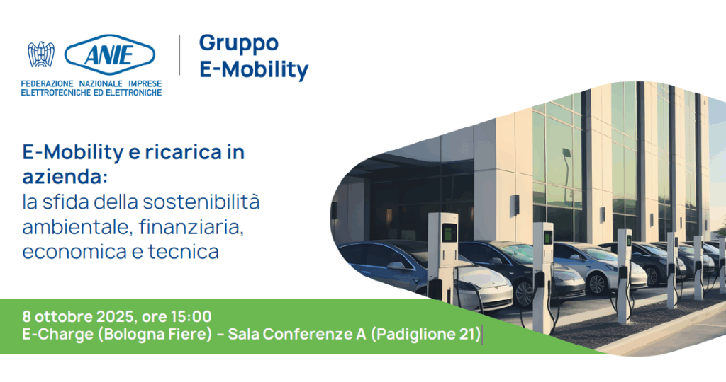 Nell’ambito della Fiera E-Charge di Bologna (8-9 ottobre 2025) si terrà il Convegno dal titolo “E-Mobility e ricarica in azienda: la sfida della sostenibilità ambientale, finanziaria, economica e tecnica” organizzato dal Gruppo E-Mobility di ANIE.