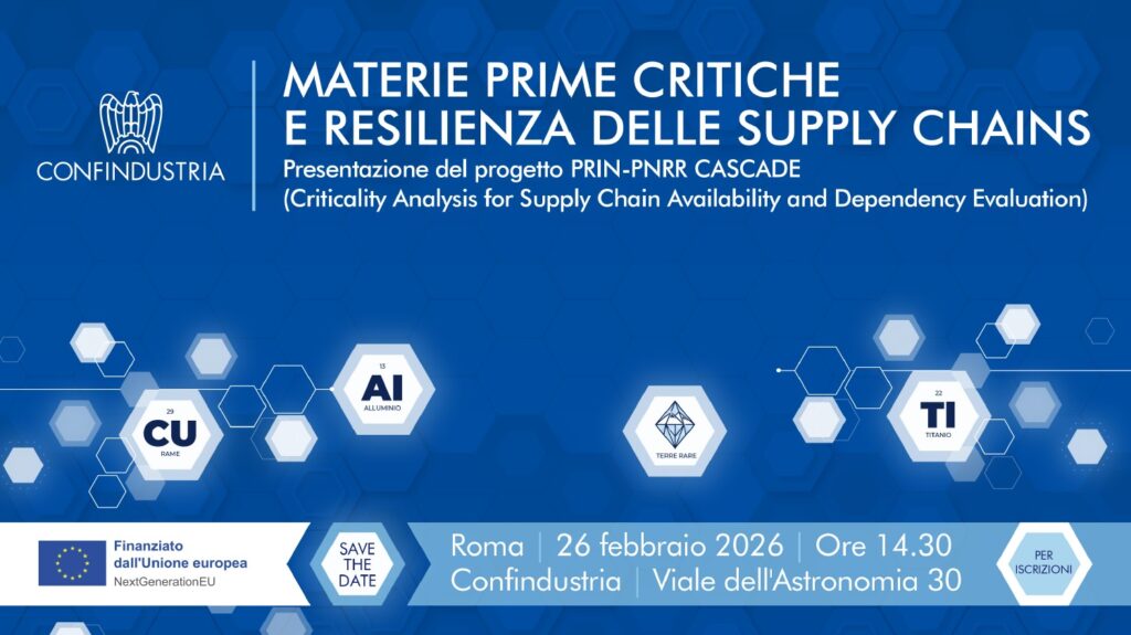 Il prossimo 26 febbraio 2026, dalle ore 14.30 alle ore 16.30, presso la sede di Confindustria a Roma si terrà l’evento “Materie prime critiche e resilienza delle supply chains” – Presentazione del progetto PRIN-PNRR CASCADE (Criticality Analysis for Supply Chain Availability and Dependency Evaluation)”.